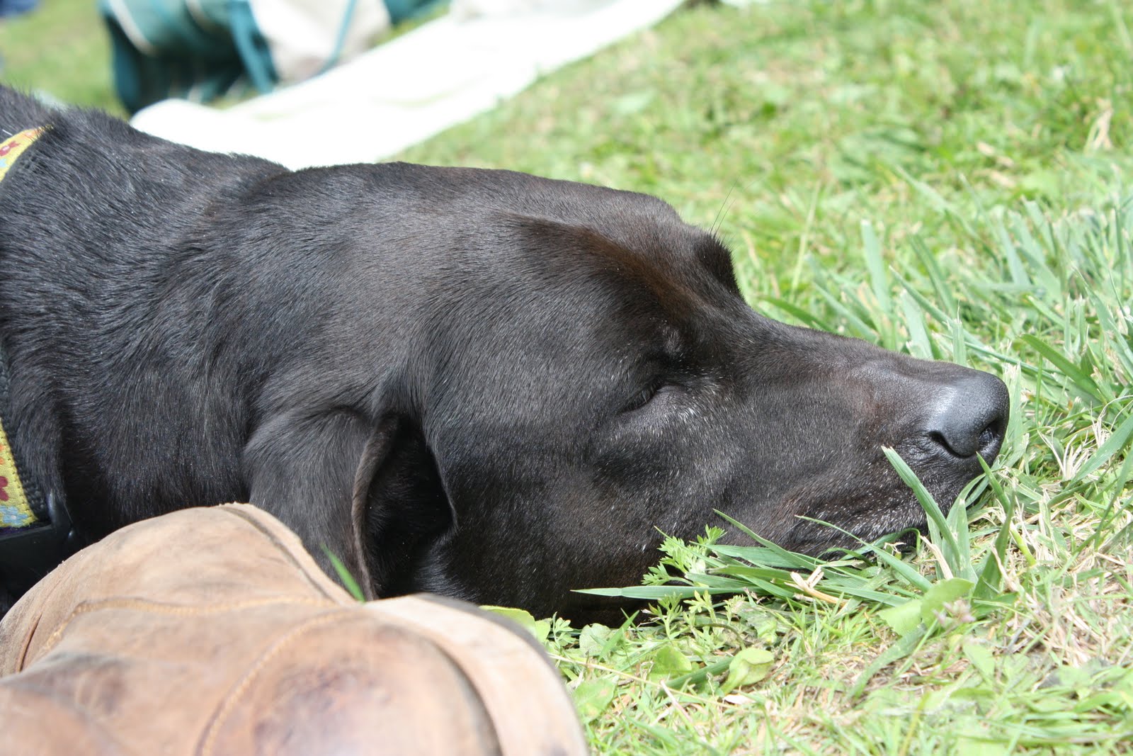 In fact, they were probably one of the more entertaining aspects of the day. Someone brought a remote controlled toy car and the dogs were dashing between legs and through the grass, chasing it aroounnd and arrouund. Seriously though, that toy car was giving even the largest dogs a run for their money! It must have had some sort of suped-up engine.. if toy cars even have such. After about a thirty minutes of non stop racing, most of the dogs retired for a mid afternoon nap. This black lab took a liking to Ryan and fell asleep right next to his foot. Aww! :)